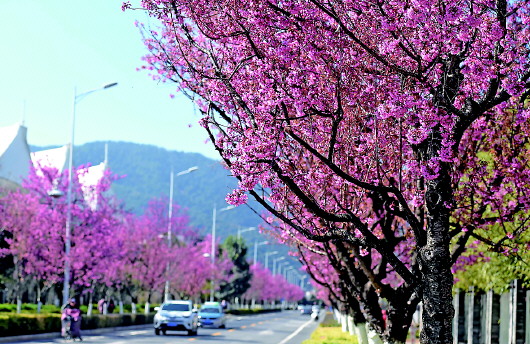 这是1月7日在昆明市红塔西路拍摄的盛开的冬樱花。近日,春城昆明阳光明媚,冬樱花绚烂绽放,美景如画。 新华社记者蔺以光摄