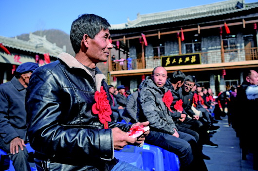 1月7日,村民康耀林(前)在分红大会上领到分红。