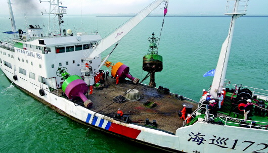 1月8日,在琼州海峡海域海巡172船起吊旧标体(无人机照片)。