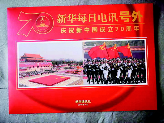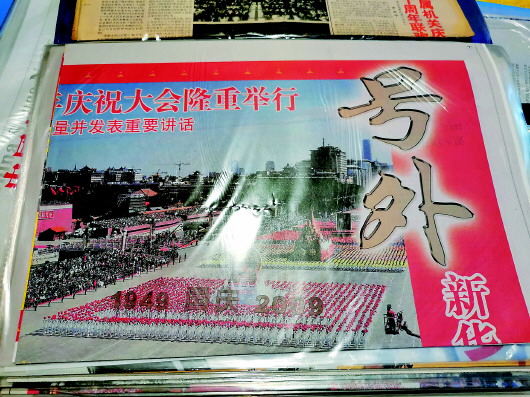 老马喜欢以报会友。采访当天,记者刚踏进集报室的门,他就把标有国庆主题的集报册抱出来放在一张小凳上,按照插在第一页的手写目录快速往后翻,“啪”的一声,他的手停在一张庆祝新中国成立60周年的号外上。“喏,《新华每日电讯》10年前的国庆号外,你们手头都不一定有了吧?!”