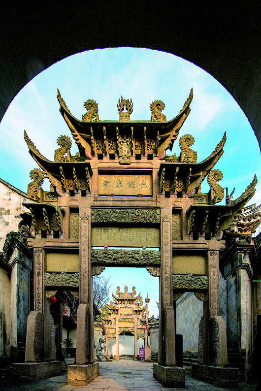 漫步在浙江湖州南浔古老的石板路上,穿街走巷,寻根溯源,仿佛回到那发黄的方志所记载的峥嵘岁月。1842年,上海被辟为通商口岸以后,聪慧的南浔人凭借名甲天下的“辑里湖丝”,从家乡的青石板路走向上海滩,与洋人做生意,涌现了一批巨富大贾,俗称“四象八牛”,是中国近代最大的丝商群体。这些名门望族留下了很多宅第。当我跨入一座座名门宅第,抬头凝视着一座座砖雕门楼,仿佛与那些身穿长袍马褂或西装革履的先贤会晤,聆听他们叙说百年沧桑的家风故事。