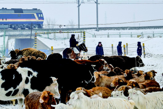 ▲1月6日,武汉铁路警察周晨宇(右)与同事在武汉天兴洲长江大桥上巡逻。 本报记者肖艺九摄