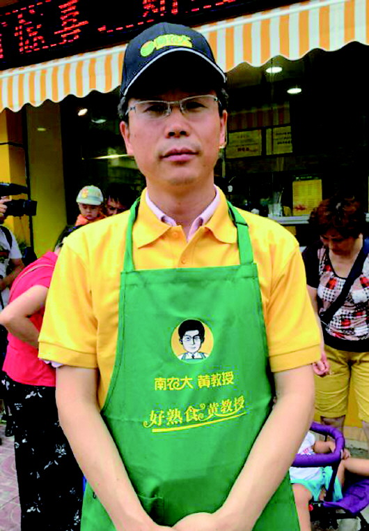 走近这家店,明黄色的门头上赫然印着一位戴着眼镜、学者模样的卡通代言人,其原型就是黄教授熟食店的品牌创始人——南京农业大学食品科技学院教授黄明。