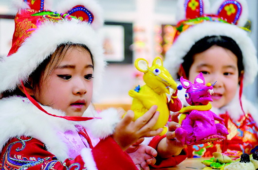 两名儿童拿着老鼠造型的花馍。1月10日,陕西省西安市碑林区文化馆开展年俗体验活动,让孩子感受浓浓年味。 新华社记者刘潇摄