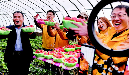 1月10日,陕西省渭南市合阳县启动“电商赶大集、致富奔小康”电子商务线上商品交易活动。一家电商平台工作人员在直播推广刚上市的草莓。 新华社记者陶明摄