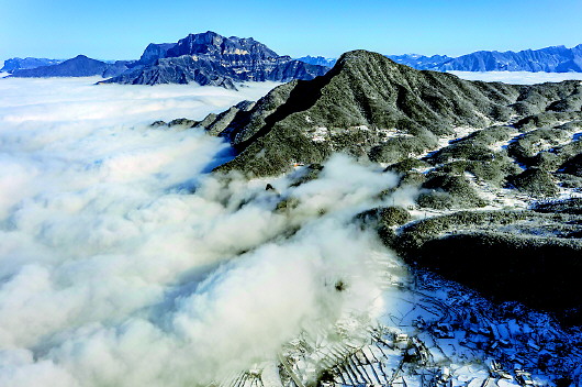1月12日,湖北五峰国际滑雪场雪后初晴,云雾和高山雪景勾勒出一幅幅美丽的图画。