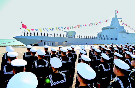 ▲1月12日,中国人民解放军海军055型驱逐舰首舰南昌舰归建入列仪式在青岛某军港码头举行。