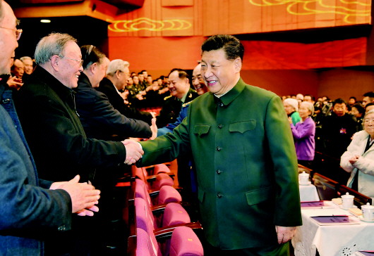 下午4时许,习近平来到老同志中间,全场响起热烈掌声。习近平同大家亲切握手,关切询问他们的身体和生活情况,共同回顾过去一年党、国家、军队事业取得的重大成就。老同志们一致表示,要更加紧密地团结在以习近平同志为核心的党中央周围,以习近平新时代中国特色社会主义思想为指导,贯彻习近平强军思想,贯彻新时代军事战略方针,坚持政治建军、改革强军、科技强军、人才强军、依法治军,不忘初心、牢记使命,锐意进取、开拓创新,为实现国防和军队建设2020年目标任务,为夺取全面建成小康社会伟大胜利作出新的贡献。