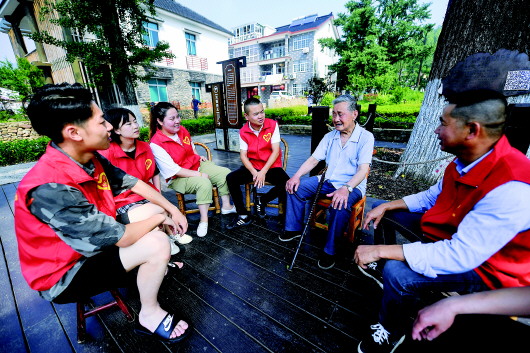 ▲浙江省长兴县小浦镇方一村的老党员周何银(右二)给村里的年轻党员讲述自己年轻时的入党经历(2019年6月28日摄)。 新华社记者徐昱摄