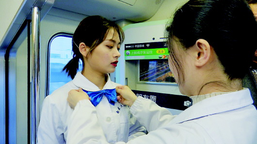 杨雨琳(左)参加列车义诊前,在车厢连接处和同事整理着装。 新华社发(刘宇轩摄) |