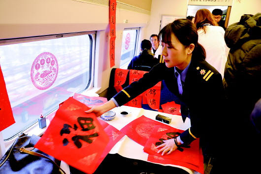 狄亚楠在车厢内为旅客书写福字。新华社发(李世杰摄)