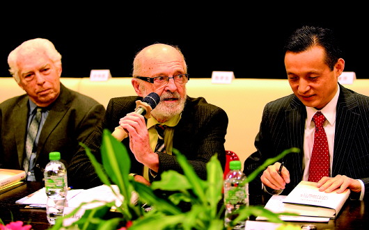 《之江新语》读者交流会十四日在捷克首都布拉格举行。这是捷克亚洲协会主席希马(中)在《之江新语》读者交流会上讲话。 新华社发(达娜·科什奈洛娃摄)