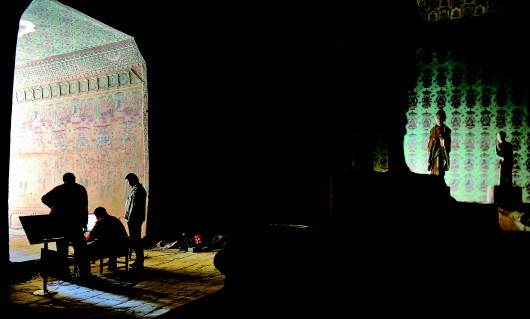 三名敦煌研究院数字中心工作人员在洞窟内进行数字采集工作(2014年9月1日摄)。 新华社记者陈斌摄