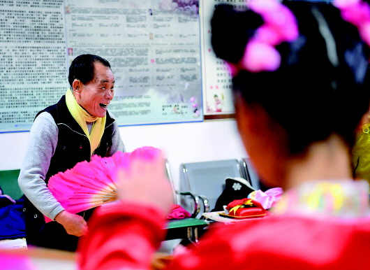 1月15日,在广西柳州市柳城县大埔镇靖西村,周锡生在家里给小演员排练彩调节目。
