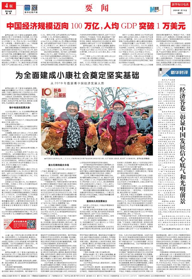 新华社北京1月17日电(记者陈炜伟、安蓓、申铖)经济总量接近100万亿元、人均国内生产总值突破1万美元,国家统计局17日发布的2019年中国经济成绩单,凸显中国经济里程碑式的新跨越。
