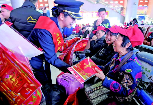 ▲1月17日,福建泉州火车站工作人员巫铁芸(左)为搭乘专列回湖北天门市过年的王红英赠送春联。据介绍,2020年春运期间,在泉州市总工会、铁路交通等部门的帮助下,泉州市将有近3000名外来务工人员分别搭乘4趟专列返乡。