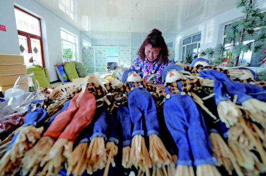 1月16日,在康平县西关屯蒙古族满族乡罗家屯村,村民在扶贫车间加工制作布偶。