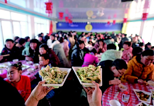 1月17日,上黄花塔拉嘎查集体过大年活动中大家一起吃饺子。本报记者刘磊摄 |