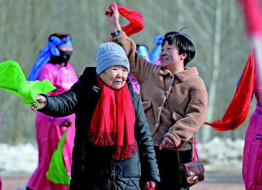 1月17日,82岁的萨木嘎拿起绸带加入秧歌队和大家一起扭了起来。 本报记者任军川摄 |