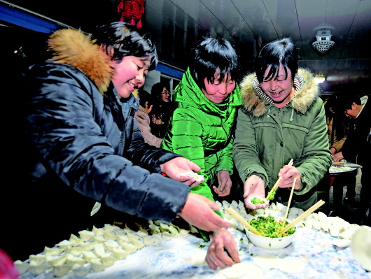 1月16日,几名妇女在上黄花塔拉嘎查集体过大年活动中包饺子。本报记者任军川摄
