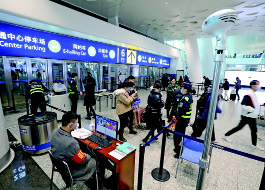 ▲1月21日,在武汉天河机场,工作人员对旅客进行体温检测。     新华社记者肖艺九摄