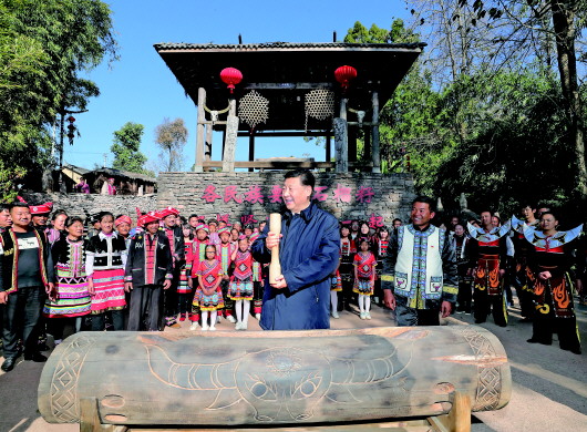 ▲1月19日下午,习近平在腾冲市清水乡三家村中寨司莫拉佤族村广场上,敲响三声佤族木鼓,祝福来年风调雨顺、国泰民安。