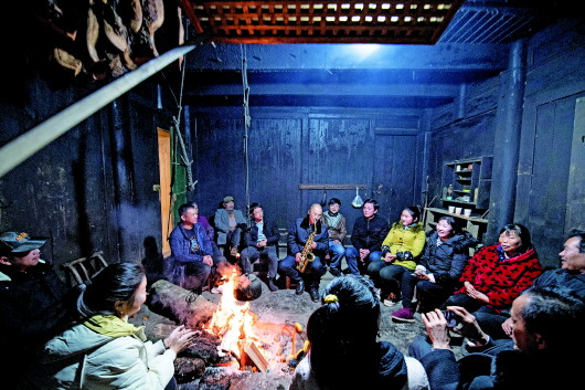 1月21日,在湖南石门县南北镇金河村,晚饭后扶贫队长张忠富为村民们即兴表演萨克斯。当日,金河村土家族脱贫户邓先鹤一家邀请驻金河村扶贫队长张忠富一起过赶年——当地土家族习俗。据了解,邓先鹤在金河村扶贫队长张忠富的帮助下,发展养蜂、种植中药材等产业,于2018年正式脱贫,在脱贫不脱政策的关怀下,张忠富继续为邓先鹤提供帮扶指导,干群关系和睦融洽,亲似一家。