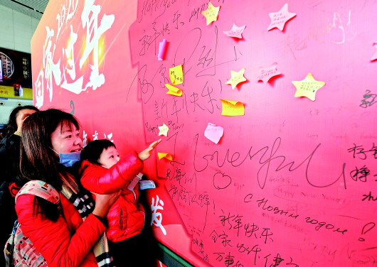 1月19日,在江苏镇江火车站,旅客在新年许愿墙前查看留言。 新华社发(刘玉和摄)