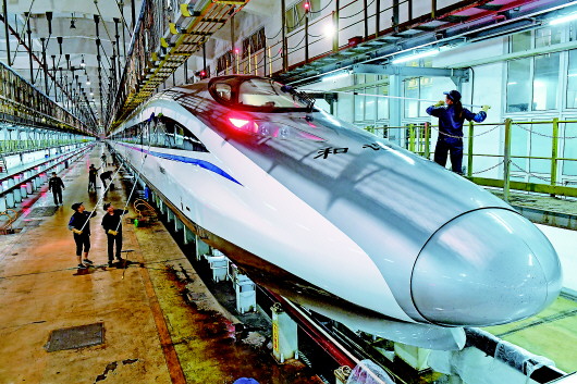 1月21日,福州动车段洗车工在清洗动车组。春运迎来客流高峰,铁路部门工作人员日夜坚守岗位。