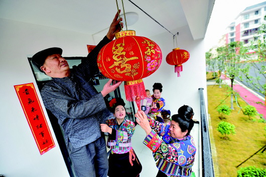 ▲1月24日,在贵州丹寨县易地搬迁安置点金钟社区,杨杰山(左一)和家人一起挂灯笼。这是苗族同胞杨杰山全家首次在新居过年。