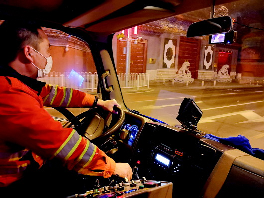 ▲1月25日凌晨,坚守岗位的北京地杰机扫保洁服务中心环卫工人张铁强正驾驶车辆清扫街道。