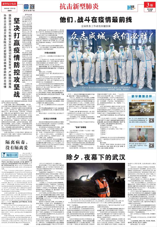 这个夜晚,武汉大学中南医院重症医学科主任彭志勇的身影依旧在病房中穿行。新型肺炎病人黄淑丽向他挥手,他们互道新年快乐。经过10余天的治疗,黄淑丽病情正在好转,下午,已经被转入了普通隔离病房。