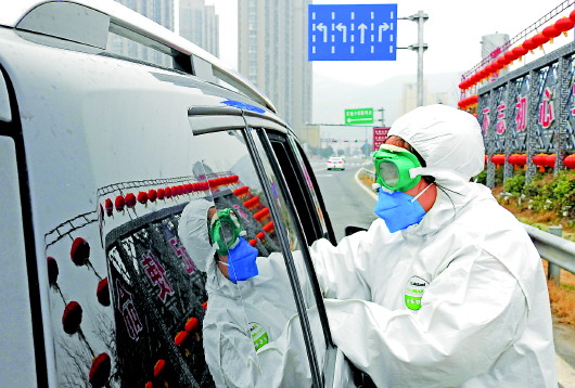 1月26日,江苏连云港市一处交通卫生检疫站,卫生检疫人员对车辆上的人员进行体温检测。