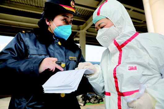 1月26日,中国铁路兰州局集团有限公司疾控所技术人员燕凤梅(右)在兰州站站台同K1027次列车长姚霞沟通车厢消毒情况。近日,中国铁路兰州局集团有限公司疾控所组织专业技术人员对车站及旅客列车全面开展消毒工作,全面监测登记旅客体温。新华社发(杜哲宇摄) |