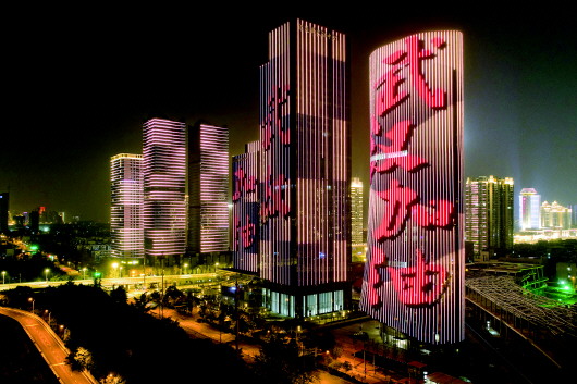 1月31日,武汉市武昌区高层建筑外墙打出“武汉加油”字样(无人机照片)。 新华社记者程敏摄