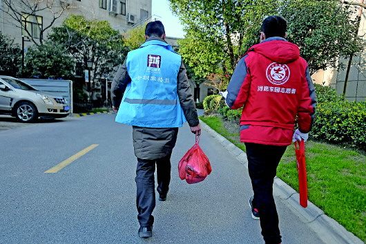 在浙江省湖州市南浔区南浔镇浔南社区,专职网格员和志愿者准备为一户实行居家隔离的居民送去食物(1月31日摄)。 新华社记者黄宗治摄