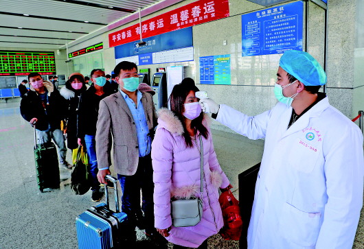 在江西吉安泰和县火车站,医务人员为乘客测量体温。连日来,各地积极采取多种措施加强疫情防控。 新华社发(司马天民摄)
