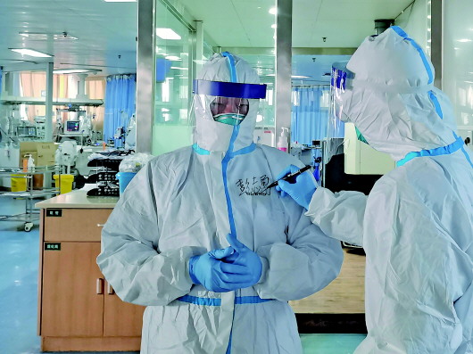 2月5日,武汉大学中南医院重症医学科主任彭志勇(左)走进隔离病房准备救治患者,一名医生在他的隔离服上写下名字(手机拍摄)。新华社发(钟南轩摄) |
