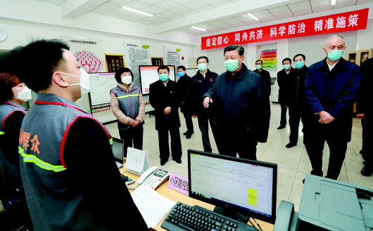 习近平首先来到北京市朝阳区安贞街道安华里社区,了解基层一线疫情联防联控情况。在社区居民委员会疫情防控指挥部,习近平听取了安贞街道和安华里社区开展联防联控情况介绍。习近平对社区采取多项措施,落实防控责任,实现入户排查、重点群体监控“两个全覆盖”等做法表示肯定。他强调,社区是疫情联防联控的第一线,也是外防输入、内防扩散最有效的防线。把社区这道防线守住,就能有效切断疫情扩散蔓延的渠道。全国都要充分发挥社区在疫情防控中的阻击作用,把防控力量向社区下沉,加强社区各项防控措施的落实,使所有社区成为疫情防控的坚强堡垒。要以疫情防控工作成效来检验和拓展“不忘初心、牢记使命”主题教育成果,发挥基层党组织政治引领作用和党员先锋模范作用,把社区居民发动起来,构筑起疫情防控的人民防线。