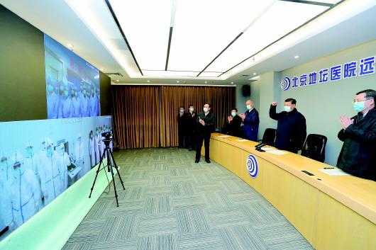 习近平十分牵挂湖北和武汉的疫情。在地坛医院远程诊疗中心,习近平通过视频连线武汉市收治新冠肺炎患者的金银潭医院、协和医院、火神山医院,向疫情防控一线的医务工作者、干部职工和人民解放军指战员了解情况、听取意见和建议。他强调,全国广大医务工作者不忘初心、牢记使命,响应党的号召,义无反顾冲上疫情防控第一线,同时间赛跑,与病魔较量,顽强拼搏、日夜奋战,展现了对党、对人民高度负责的精神面貌。他指出,现在疫情防控正处于胶着对垒状态,广大医务工作者一定要坚持下去,发扬特别能吃苦、特别能战斗的精神,发挥火线上的中流砥柱作用,始终把人民群众生命安全和身体健康放在首位,全力以赴救治患者,打好武汉保卫战、湖北保卫战。