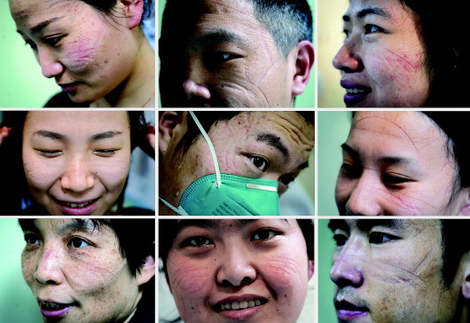 ▲这是2月6日拍摄的南昌大学第一附属医院象湖院区隔离病房重症监护室医护人员脸上被护目镜和口罩压出的印痕(拼版照片)。