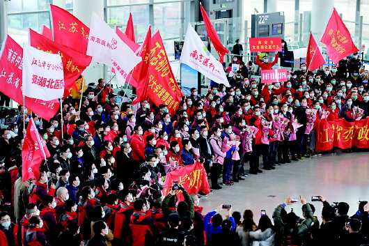 2月11日,江苏援黄石医疗支援队310名队员从南京出发,奔赴湖北省黄石市开展对口支援新冠肺炎防治工作。 新华社记者季春鹏摄