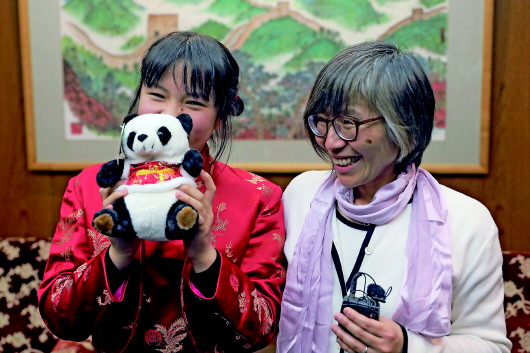 2月13日,在日本东京中国驻日本大使馆,为中国武汉募捐的旗袍女孩(左)拿着大熊猫玩偶和母亲杉崎广子接受记者采访。