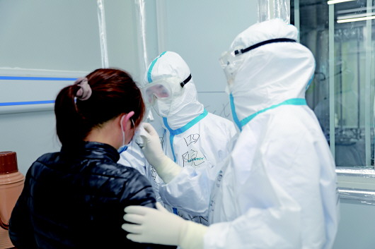 2月16日,在武汉雷神山医院病房,医护人员安慰一名新入院患者。当天,武汉雷神山医院收治新冠肺炎患者100人。 新华社发(高翔摄)