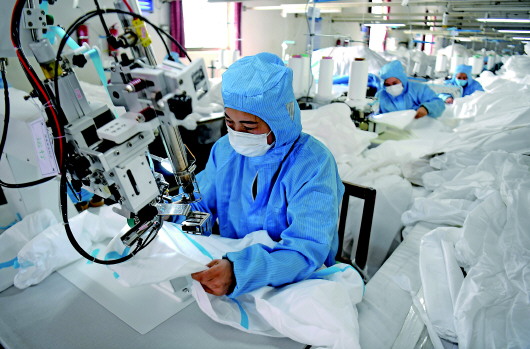 ▲河北省宁晋县一家防护服企业的员工在生产防护服(2月12日摄)。新华社记者王晓摄 |