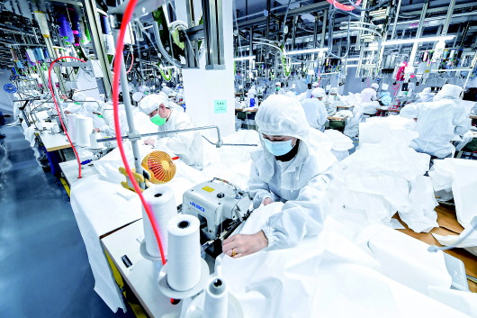 深圳赢家服饰有限公司拥有成熟的服装制造生产线,春节期间接到医用防护服代加工的任务后,在两天时间内迅速“转型”,辟出1000平方米的车间改造为无菌生产车间,召集约80名留驻的熟练工复工,为医疗企业稳健医疗用品股份有限公司进行防护服加工,加工后再送往稳健公司进行消毒和封装。随着工艺的熟练,企业目前防护服日产量可以达到1800件以上。新华社记者毛思倩摄
