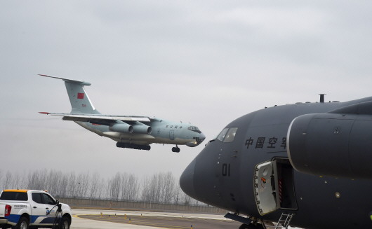 ▲2月13日,空军出动3型11架运输机多地同步向武汉空运医疗队员。这是一架伊尔-76运输机(左)和国产运-20运输机(右)。 新华社记者黎云摄 |