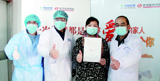 2月18日,在武汉市金银潭医院,程琳(右二)在捐献血浆后与医护人员合影留念。当日,武汉市金银潭医院院长张定宇的夫人程琳来到金银潭医院,捐献了400毫升血浆。程琳1月19日确诊新冠肺炎后在武汉市第四医院接受治疗,于1月29日康复出院。新华社发(武汉市金银潭医院供图)