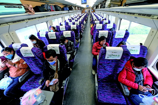 2月19日,广西首趟定制复工专列从百色站发出,开往广州南站。广西百色市700多名务工人员乘专列赴粤返岗复工。 新华社记者陆波岸摄