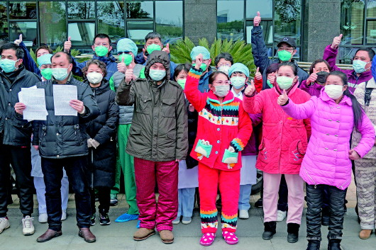 2月19日,在武汉协和医院西院区,康复出院的新冠肺炎重症患者与医护人员合影留念。当日,武汉协和医院西院区31名新冠肺炎重症患者痊愈出院。他们之前经过近两周的治疗护理,已经符合出院标准。 新华社记者才扬摄